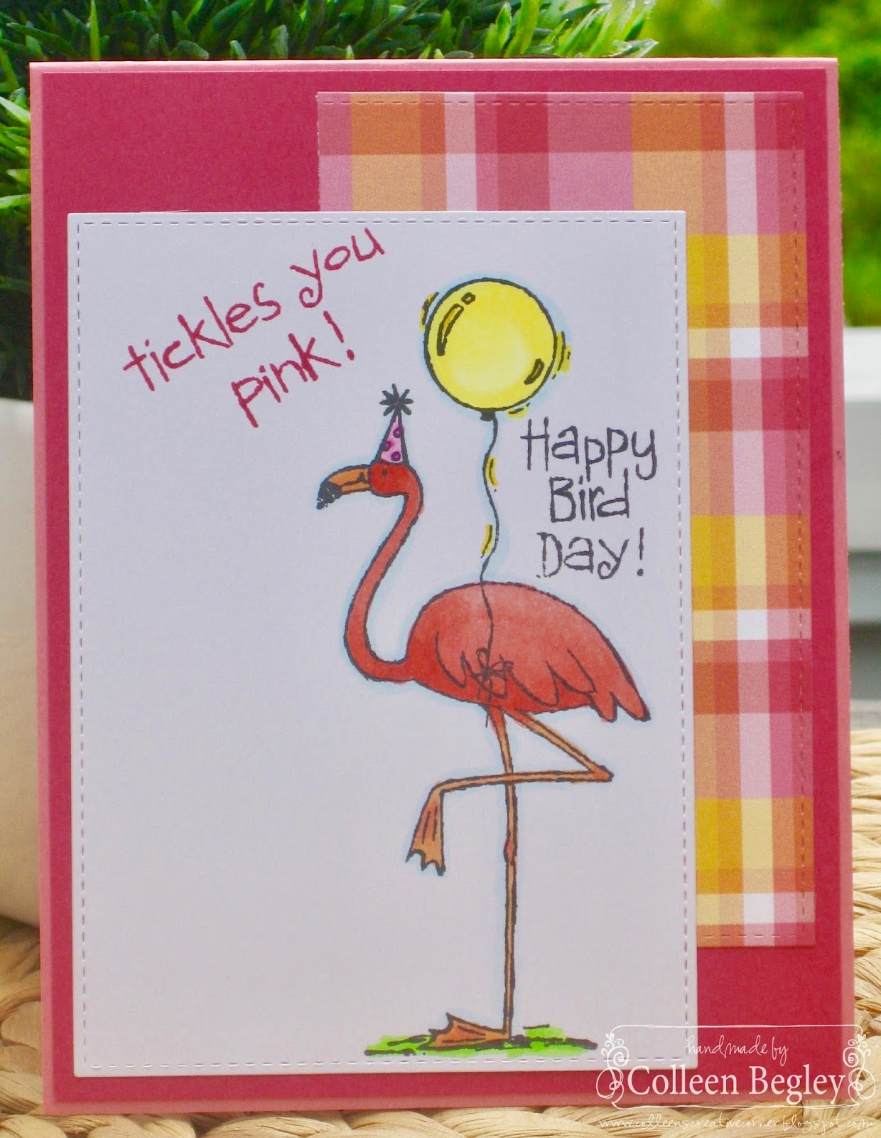 I rotated the sketch one turn clock-wise to accommodate the tall flamingo image. This stamp set is Stampin' Up from 2002! The images are stamped in Memento tuxedo black on X-Press It Blending card stock and colored with Copics. After coloring, I fussy cut out the image. The background plaid paper is Lawn Fawn and the dies are all Die-namics.