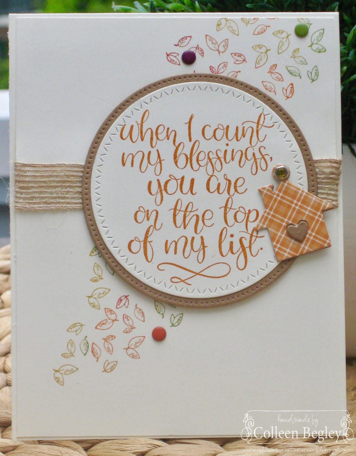Other: SU burlap ribbon, Die-namics circle dies, TE House tag, SU rhinestone brad, SU candy dots,