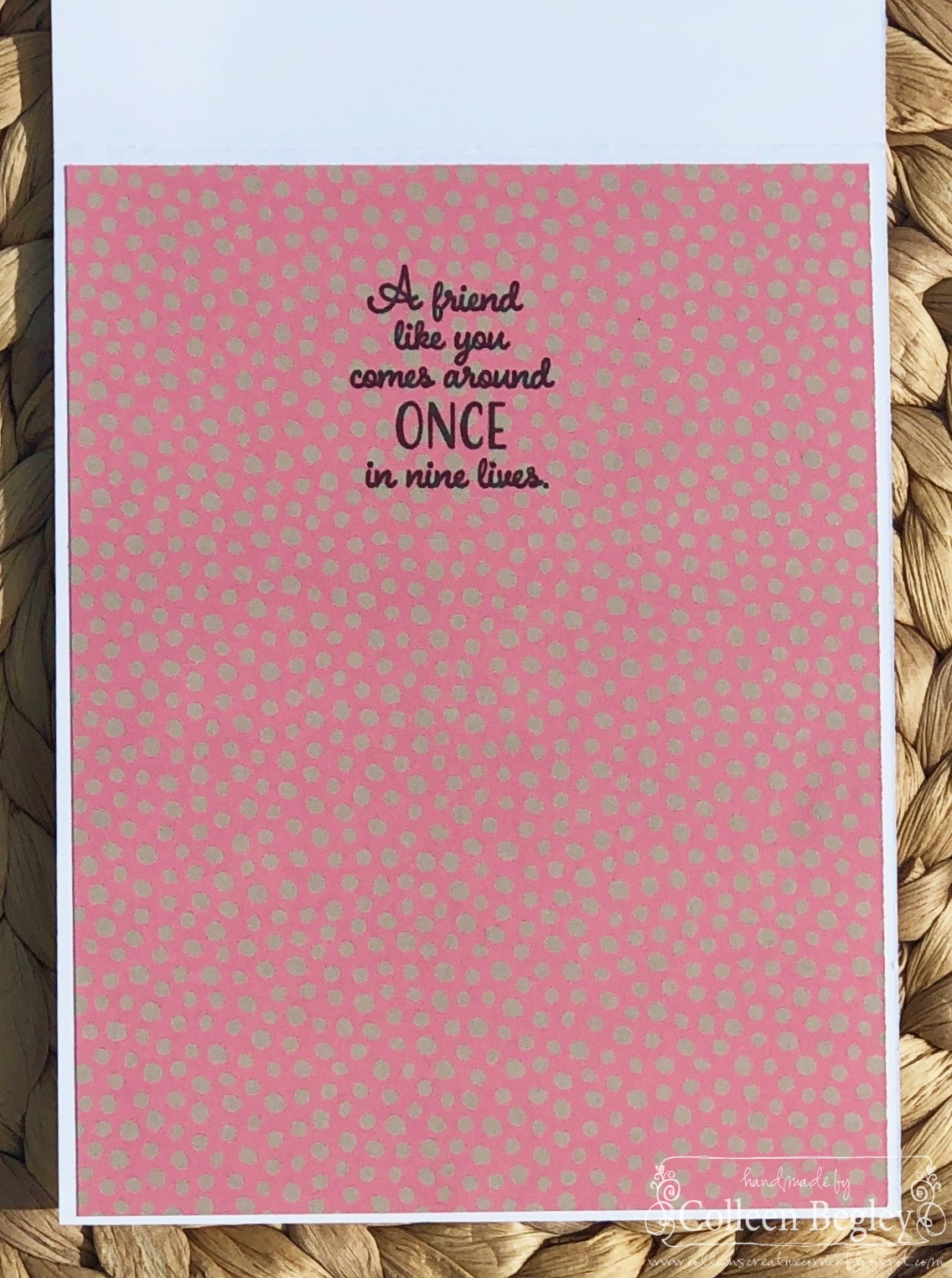 The sketch comes from this week's CAS(E) This Sketch! I stamped the kitty outline in Memento black and used a light yellow Copic to color her in. The stamp set has two stamps that add the fur and I've used one with gold and orange ink to make the stripes. There is a coordinating SU punch for the kitty and I used dimensionals to adhere her to the card.