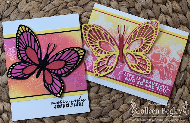 I wanted to use some bright colors to go along with these butterflies. Both cards incorporate ink blending and emboss resist techniques.