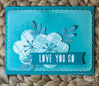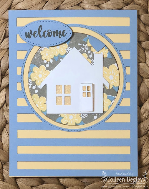 I found the Avery Elle cover die already cut in my folder of "pieces" and it happened to be in Seaside Spray and I wanted to figure out what I could use it with. While looking thought my stamp sets, I ran across this C&9th set with a circle stamp in a size that would work with the cover die. This C&9th set has three stamps that fit together, the background, the flowers, and the leaves. The set also has several dies, one being this house and the sentiments to go with.