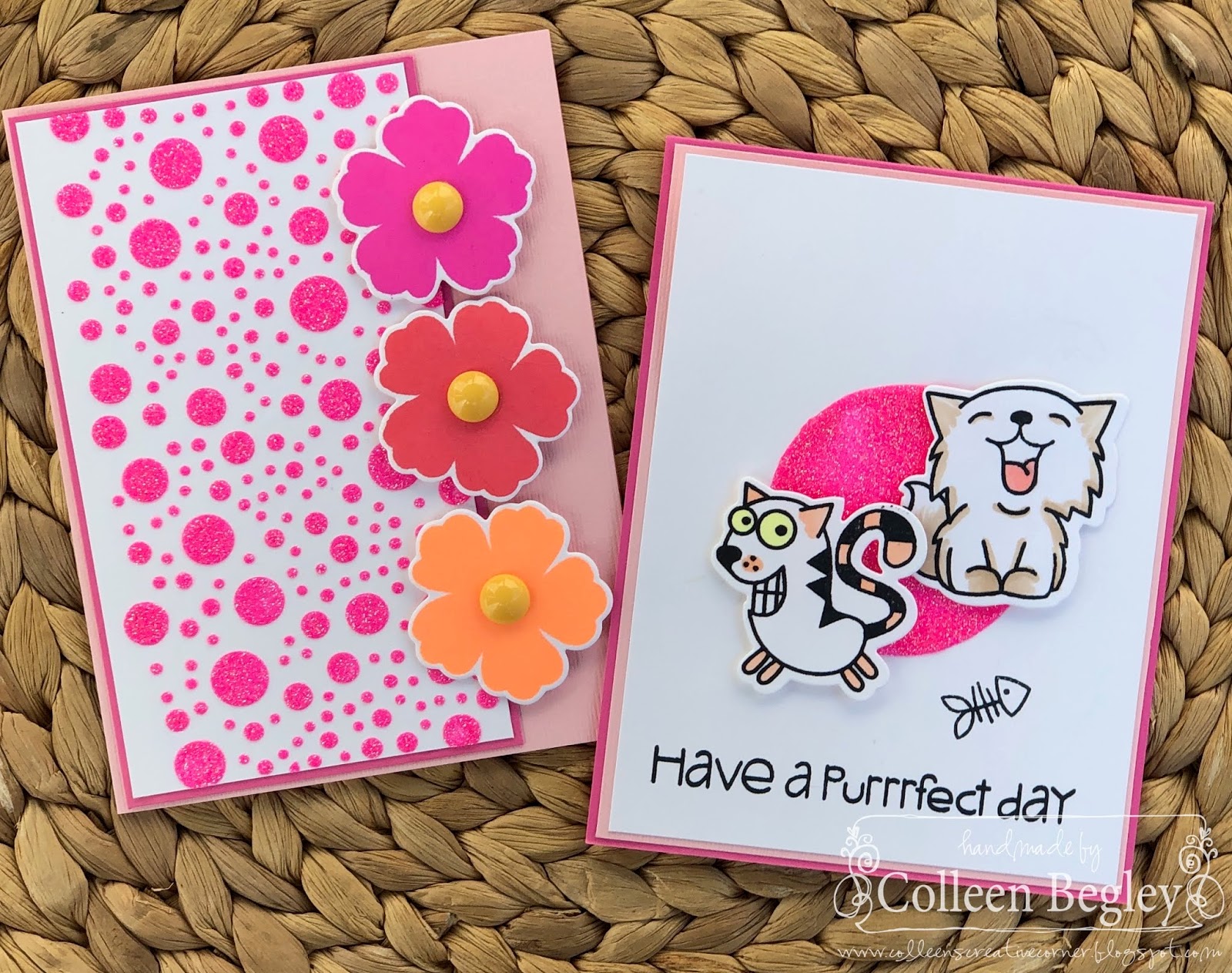 Aren't these fun and bright. The flower card is made with a Rena K stencil and a Rena K stamp and dies set. The inks are also Rena K electro pop inks. The kitty cat card is made with Paper Smooches stamps and dies.