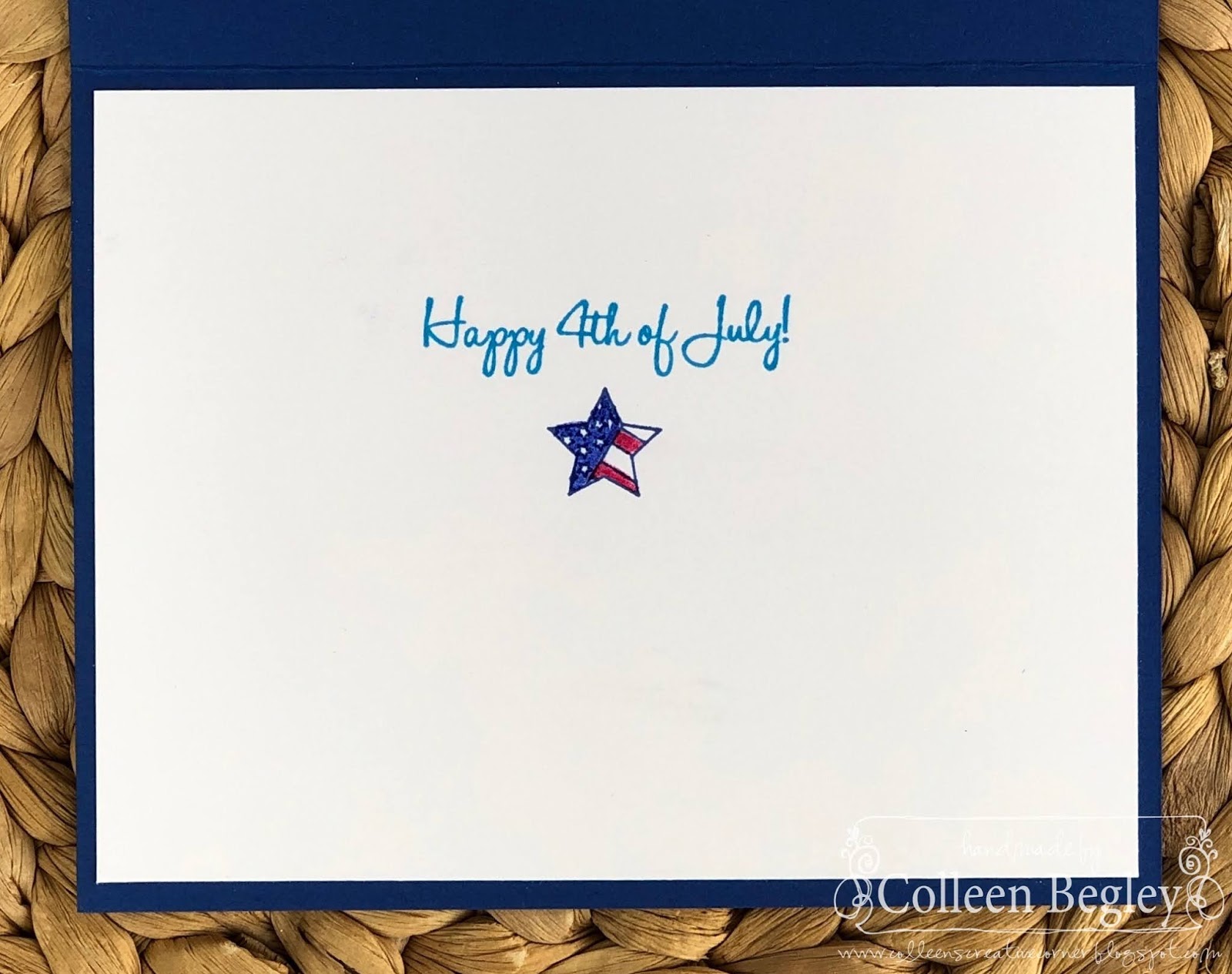 The stamp set is a very old Stampin' Up set called July 4th. I stamped the three fireworks stamps using two shades of blue and two shades of red randomly until most of the front of the card was covered. The star stamp is from this same set. I stamped two in the lighter shade of blue and punched them out using the SU medium star punch. These are layered onto slightly larger star dies cut from SU Poppy Parade paper. The sentiment strip stamp and the sentiment are from Avery Elle. I added several silver sequins and tiny clear rhinestones to the centers of the fireworks images.